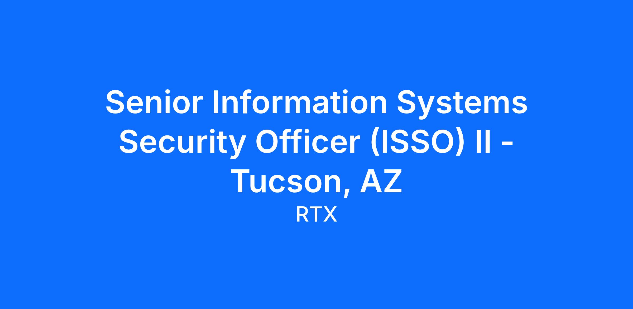 Our cybersecurity team is seeking a Senior Information Systems Security Officer (ISSO) II to support our team 100% onsite at our facility in Tucson, Arizona.